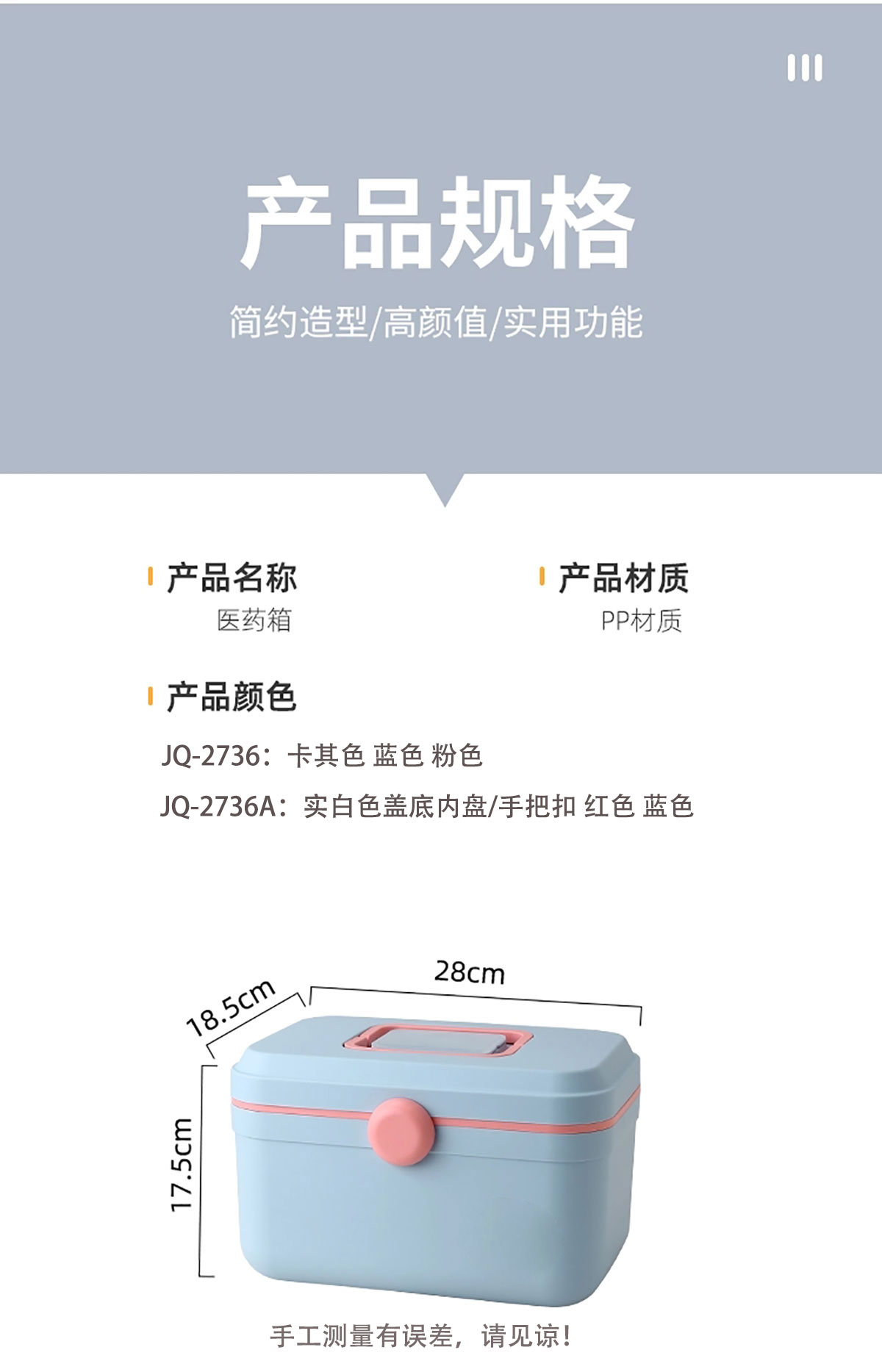 Remarks:JQ-2736:卡其色 粉色 藍(lán)色 JQ-2736A:實(shí)白色蓋底內(nèi)盤/手把扣 紅色 藍(lán)色